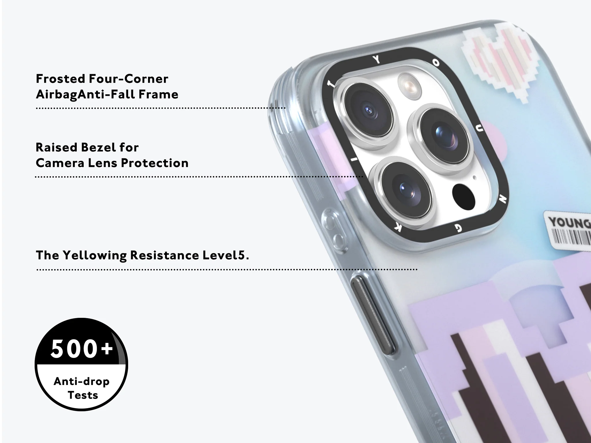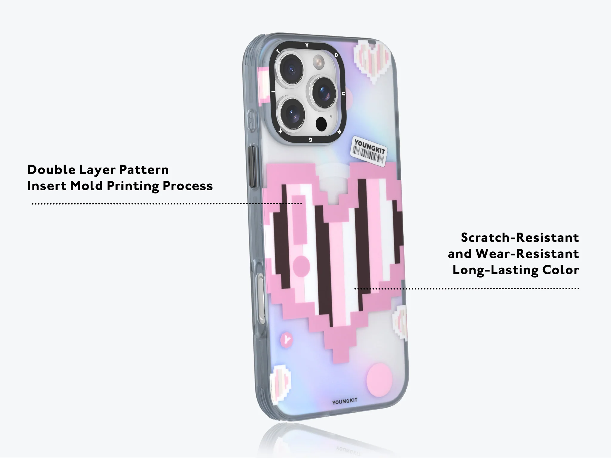 قلب پیکسلی طراحیشده روی قاب، هنگام حرکت رنگ عوض میکند و جلوهای زنده و چشمنواز به گوشی شما میبخشد.